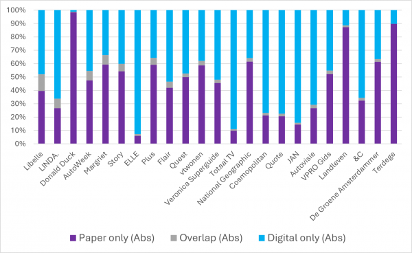 Bij een groot aantal merken vormt het digitale kanaal het grootste deel van dat bereik: bij de helft van de magazinemerken is het online maandbereik groter dan het printbereik. Hoe groot dat digitale aandeel is, verschilt per merk en hangt samen met factoren als de aard van de content, de rol voor de lezer, de verschijningsfrequentie en de omvang van het totale publiek.