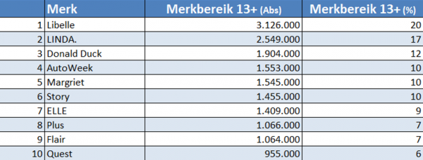 Met een indrukwekkend bereik van 3,1 miljoen Nederlanders voert Libelle de ranglijst aan. LINDA. volgt met ruim 2,5 miljoen lezers, en Donald Duck staat op de derde plaats met 1,9 miljoen. Alle merken in de top 10 behalen een merkbereik van één miljoen of meer.