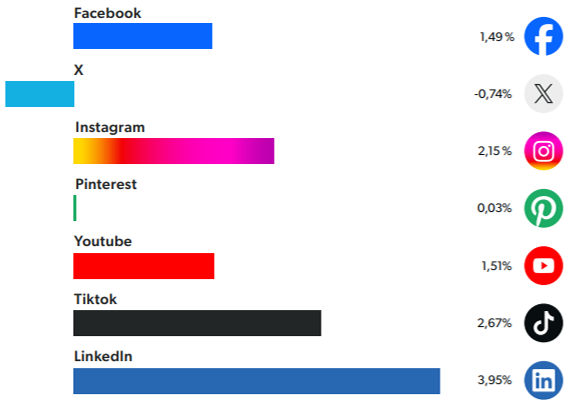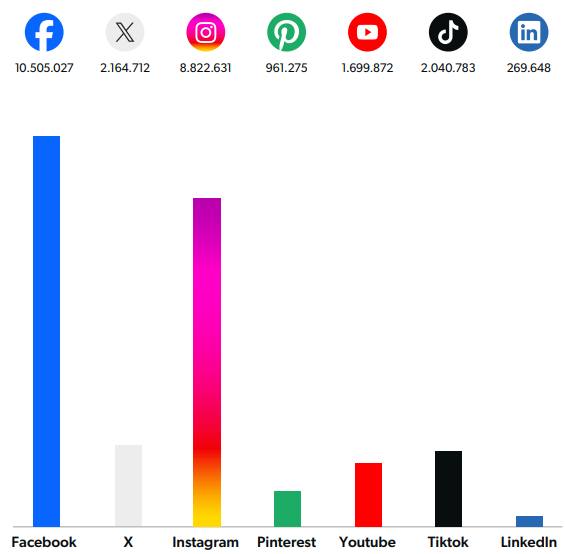 Ondanks de groei van andere netwerken behoudt Facebook het grootste aandeel binnen de magazinebranche met 40%. Daarna volgt Instagram met 33%. Het aandeel van TikTok is inmiddels gelijk aan het aandeel van X, namelijk 8%. Daarna volgen Youtube met ruim 6%, Pinterest met 4% en LinkedIn met 1%.