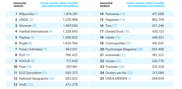 De ranglijst van de grootste magazinemerken op sociale media blijft ongewijzigd. Miljuschka blijft – over alle sociale kanalen heen – het grootste magazinemerk op sociale media. LINDA. neemt de tweede plaats in, gevolgd door vtwonen. Voetbal International en Playboy maken de top 5 compleet. Alle merken in de top 5 hebben meer dan één miljoen volgers over alle platformen heen.